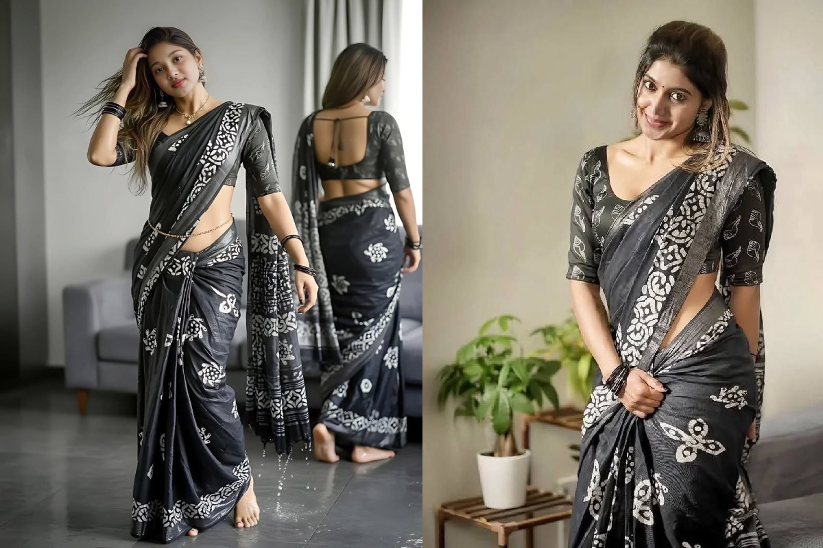 Some sarees don’t rely on shimmer, embroidery, or grandeur to make a statement. Instead, they speak through design, comfort, and quiet confidence. The black handblock printed saree in this image is a perfect example—rooted in tradition yet effortlessly modern.