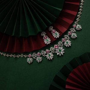 Celebrate Holi with refined sparkle through this exquisite diamond set from Kalyan Jewellers. Intricate floral motifs, encrusted with diamonds, are highlighted by pear-shaped emeralds and vibrant ruby accents, bringing together fresh greens and festive pinks in perfect harmony. Elegant yet celebratory, this set adds a sophisticated glow to your look and pairs beautifully with a rich silk saree or a contemporary pastel ensemble. |