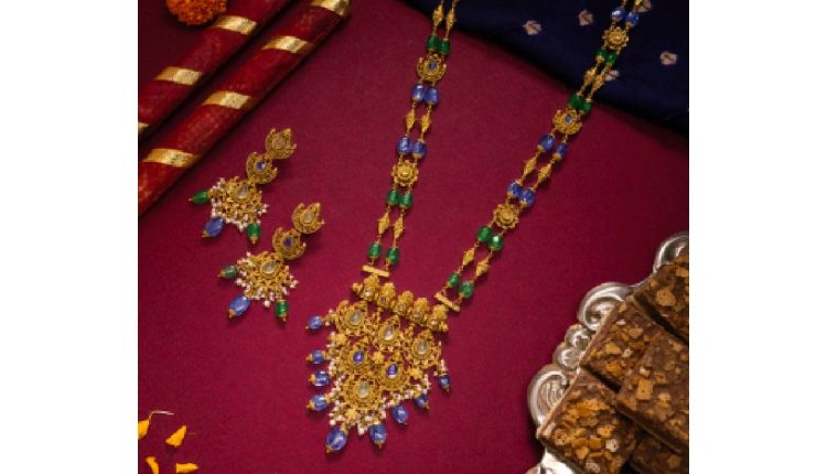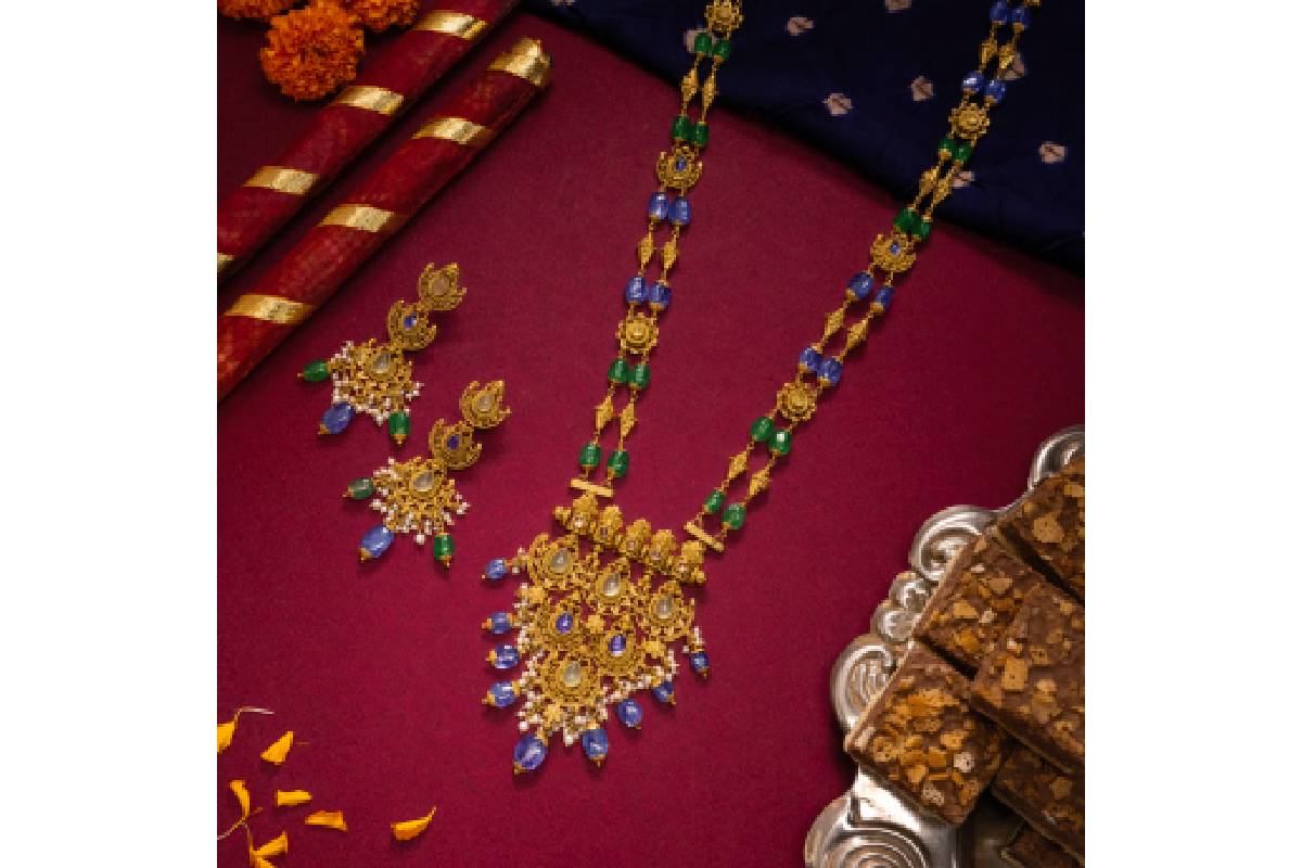 Mark the festivities of Holi with this striking antique long necklace set from Kalyan Jewellers, adorned with rich green and tranquil blue gemstones that echo the season’s lively hues. Crafted in ornate antique gold and finished with delicate seed pearls, the design blends grandeur with timeless charm. Perfect for festive celebrations, it pairs effortlessly with a white Anarkali or a deep-toned saree for a look that feels both regal and radiant. |