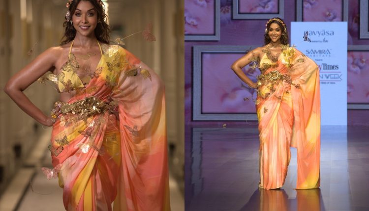 The showstopper, actress Anupriya Goenka adorned a beautiful free-flowing saree in soft pastel hues and striking bold motifs, looking surreal as she glided on the runway.
