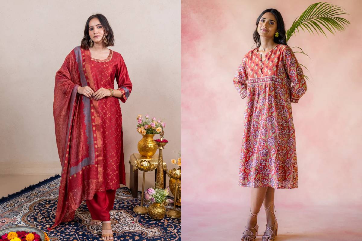 1. Aakruti Rust Ajarakh Cotton Dress Ray-Ethnic -Timeless in form and effortless in feel, this rust mul mul cotton dress is crafted in soft, breathable cotton with handcrafted Ajarakh prints and fine embroidery. Designed for comfort and everyday elegance, it’s the kind of piece that feels special without trying too hard—perfect for Valentine moments and beyond.
