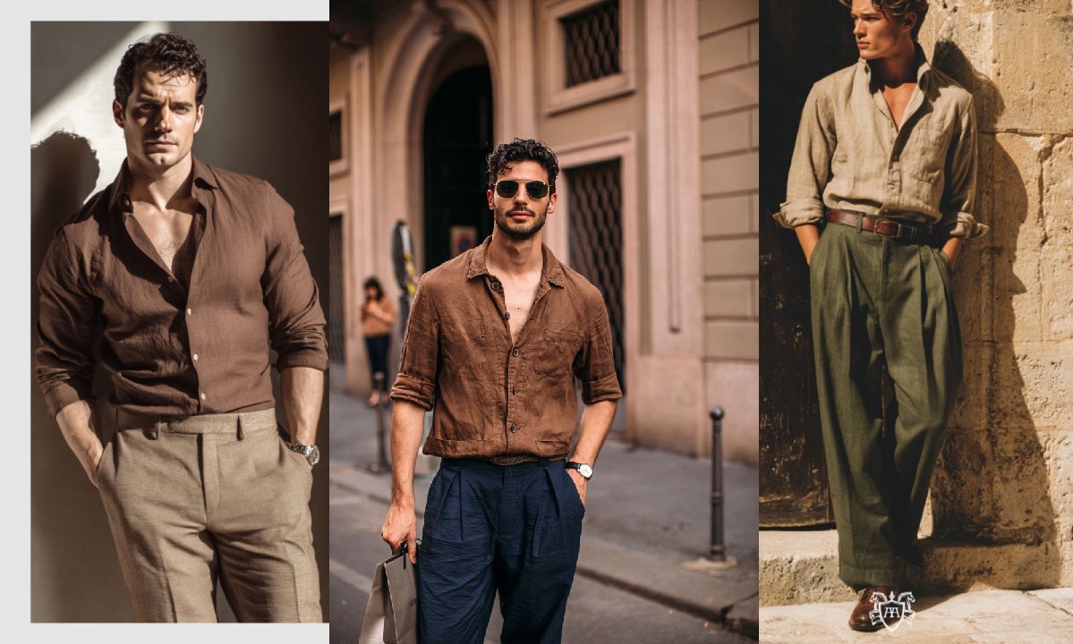 The foundation of this outfit is a neutral-toned linen shirt, worn slightly unbuttoned at the collar. Linen is a fabric that has long been associated with heritage dressing, especially in Mediterranean and vintage European wardrobes.