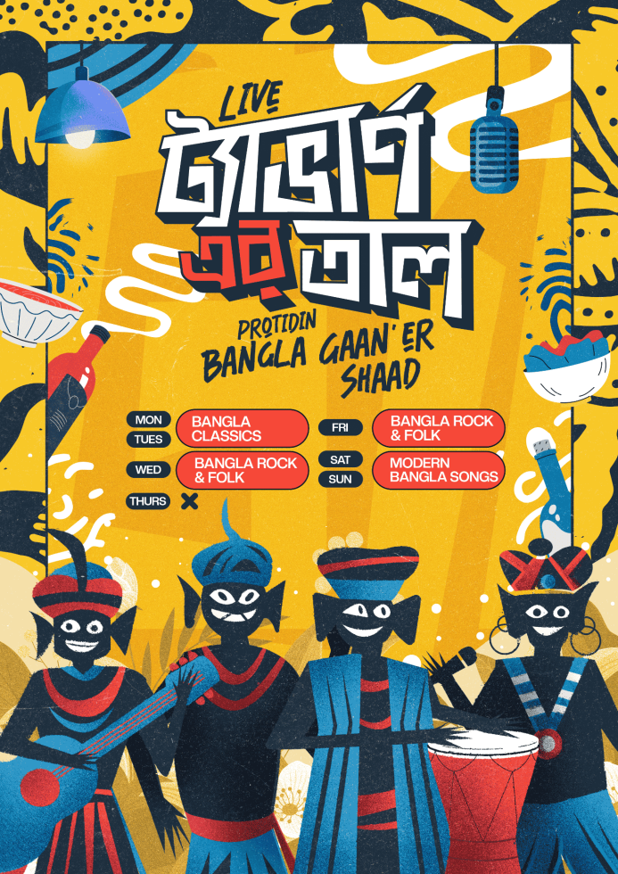 The host band Tavern ‘er Taal will present Cizzy and Banglar Thek on the 9th of April, Karaoke with KolkataPride.org on the 10th, Paloma & Adil on the 11th, and a special Poila Jam on the 12th. Performances will begin by 7:30.