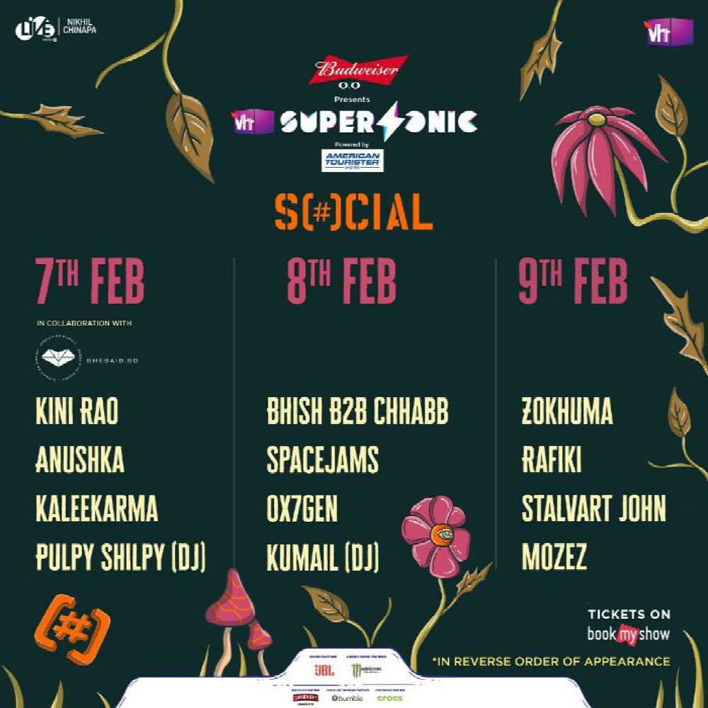 Day 1 will see an all-female lineup in collaboration with shesaid.so, a music collective that empowers women in the industry. Bringing forward Kini Rao, Anushka, Kaleekarma, and DJ Pulpy Shilpy, while Day 2 will see Bhish B2B Chhabb, Spacejams, Ox7gen, and DJ Kumail hosting an antiSOCIAL takeover. Day 3 will have Zokhuma, Rafiki, Stalvart John, and Mozez taking over the SOCIAL stage. Focusing on the diverse music genres that our country produces, the association between SOCIAL and Supersonic will result in three days of high-octane fun.