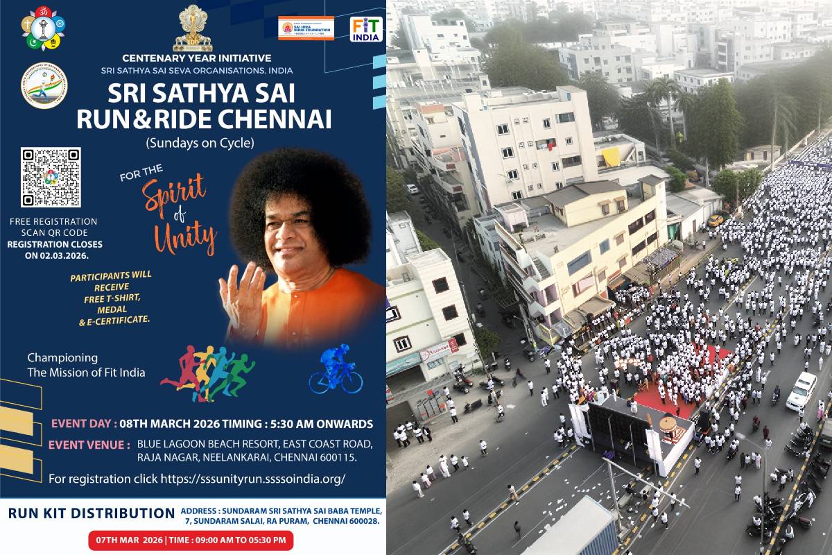The Sri Sathya Sai Seva Organisations, India will host the Sri Sathya Sai Run & Ride Chennai 2026 on March 8, 2026, as part of the Centenary Year Celebrations of Sathya Sai Baba at Blue Lagoon Resort, Neelankarai, Chennai. Organised in collaboration with the Government of India’s Fit India Movement, the event aims to inspire citizens—especially youth—to embrace health, unity, and selfless service.