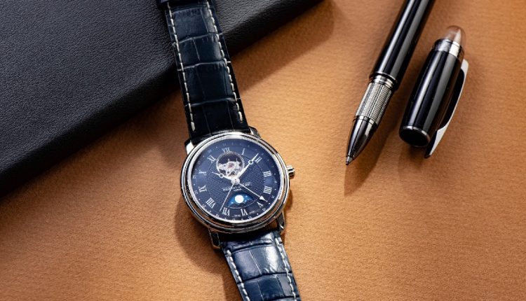 At the centre of the dial are four hands. The first two, the hours and minutes, end in a so-called “hollowed apple” motif—in Breguet style—, a subtle historical nod to the traditional aesthetic canons of early watchmaking. The next, the seconds—long and slim—keeps the time of the self-winding FC-335 movement with a 38-hour power reserve, visible through the sapphire caseback. The final hand, standing out with its arrow motif, points towards the date, shown in a circle on the flange. It is all worn on a blue leather bracelet, with white topstitching and a steel pin buckle.