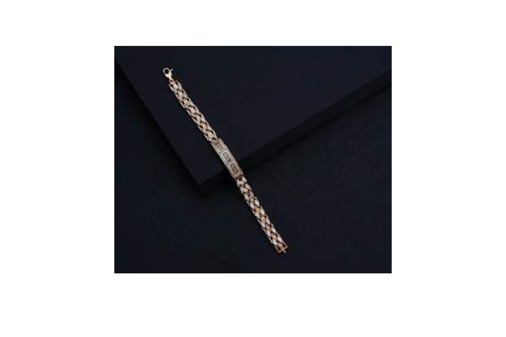 This striking men’s bracelet features an intricate two-tone design, combining rose gold and silver hues in a diamond-patterned link chain that exudes elegance and masculinity. At its center, a bold rectangular plate showcases a classic Greek key motif, adding a touch of timeless sophistication. Expertly crafted with attention to detail, this bracelet makes a refined statement—perfect for formal occasions or elevating everyday style with a hint of tradition and luxury. |