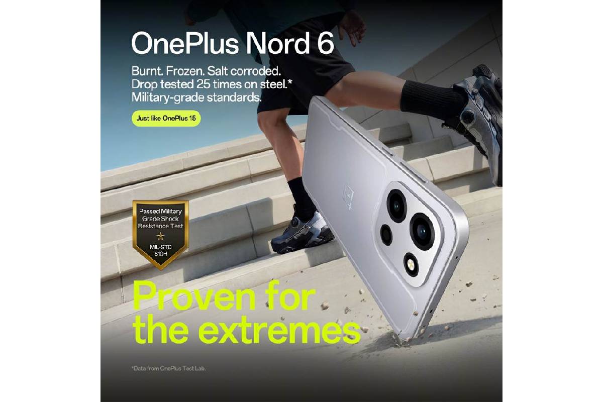 Encased in a clean, minimalist design with signature sharp edges, the OnePlus Nord 6 boasts the highest levels of dust and water resistance with IP66, IP68, IP69 and IP69K ratings, guarding against dust, water immersion, and high-pressure, high-temperature jets. The front is protected by Crystal Guard Glass, offering drop resistance and scratch protection on par with flagship-level Corning Gorilla Glass Victus+. Furthermore, the device has been rigorously tested for military-grade durability under extreme conditions, including detergent-filled hot water and repeated drop tests in line with MIL-STD-810H American military-grade standards.