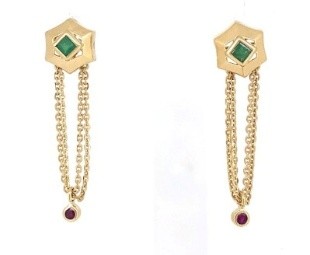 These earrings explore movement and geometry through a modern gold silhouette. A softly sculpted gold form frames a vivid emerald at the top, while delicate chain drops extend downward, creating fluidity with every movement. The design balances structure with softness, allowing the gemstone to remain the focal point while the chains introduce a sense of effortless elegance. Refined yet expressive, the earrings transition naturally from structured workwear to evening dressing.