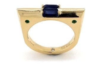 Bold yet balanced, this ring is designed as a sculptural statement. A deep blue sapphire sits prominently at the centre, framed by a smooth gold structure that gives the piece its architectural presence. Emerald accents placed along the band introduce contrast. The result is a ring that feels powerful yet refined, created for women who embrace jewellery as an extension of their individuality.