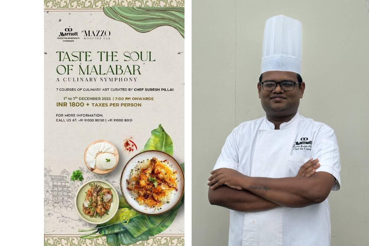 Marriott Executive Apartments Hyderabad announces Saptaswara, an exquisite 7-course menu that celebrates the soul of Kerala’s Malabar cuisine. This limited-time culinary experience, curated by Chef de Cuisine Suresh Rajan Pillai, will be available from December 1–7, 2025, exclusively at Mazzo Rooftop Bar.