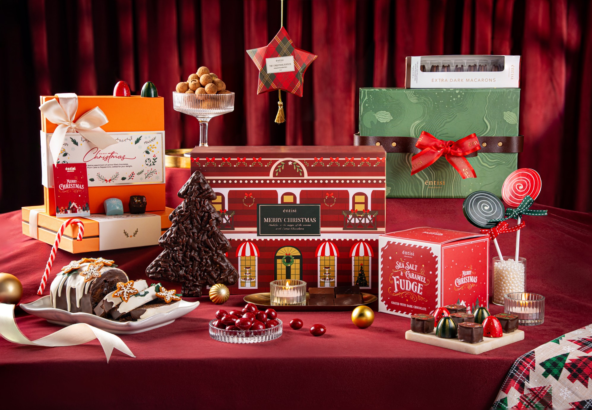 Entisi’s hampers wrap these delights beautifully. The Christmas Heritage Hamper features truffles, a classic milk bar, an extra dark macaroon, a star-shaped ornament with chocolate slims, and a peppermint lollipop. The Christmas Celebration Hamper brings together truffles, a chocolate Christmas tree, a peppermint lollipop, and cranberry dragees; perfect for joyful gifting. For chocolate lovers, the handcrafted Bonbon Boxes (16 or 25 pieces) showcase festive favourites like Gingerbread Praline, Christmas Carol, Plum Cake, Hazelnut Gianduja, and the Snowman bonbon. Completing the collection are the charming Christmas Chocolate Ornament, filled with assorted slims, and refreshing minty Chocolate Lollipops, perfect for stocking stuffers.