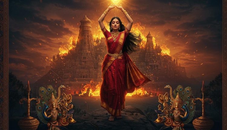 Kannagi, in a moment of fiery righteousness, proves her husband’s innocence, confronts the king, and burns the entire city of Madurai in anguish and fury. She later ascends to divine status.