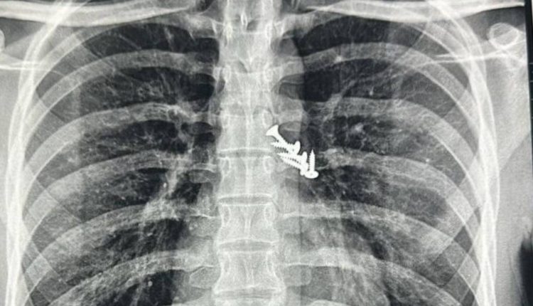 The procedure, which lasted three hours, presented significant challenges. All five screws were lodged in the left upper lobe airway and their positions were continuously shifting due to the patient’s persistent coughing, despite effective local anaesthesia. Using advanced tools, including special rat-tooth and Dormia basket forceps, the medical team successfully extracted all five screws. During the procedure, one screw slipped into the oropharynx and was swallowed by the patient. However, within 48 hours, two screws from the abdomen were naturally expelled through the faecal route.