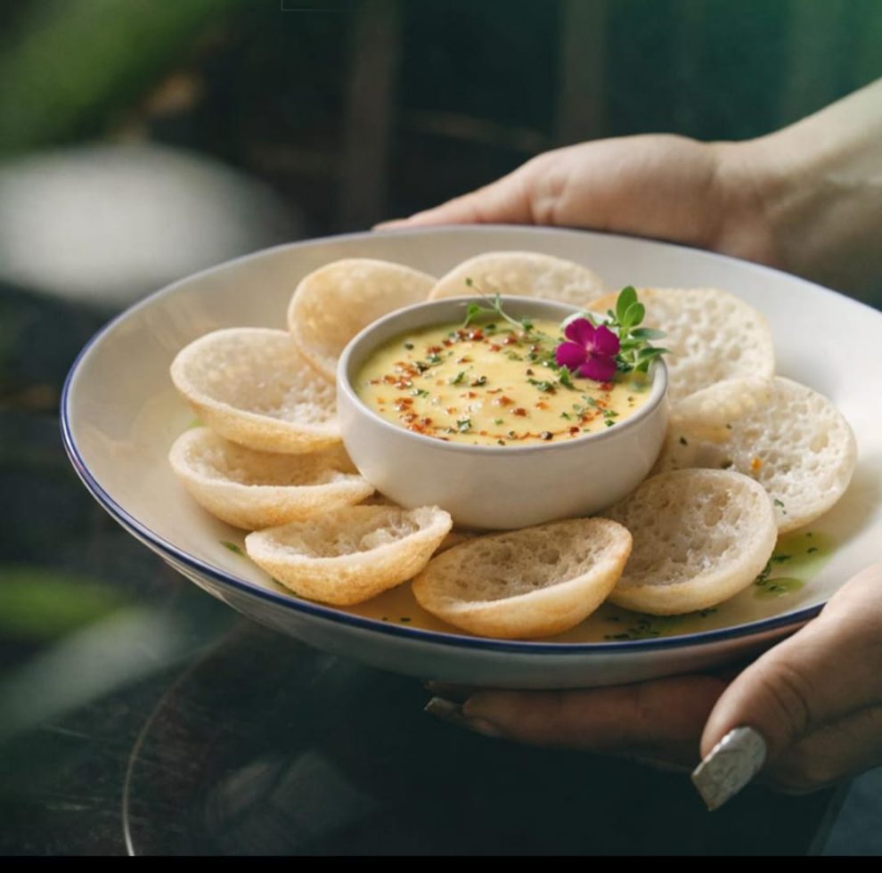 The narrative deepens with inventive small plates such as Crispy Mushroom Moringa Ravioli, Mini Appam with Madras Curry Foam, and the indulgent Four Cheese Chilli Fondue, balancing familiarity with playful reinterpretation. The non-vegetarian journey introduces signature highlights including Chekku Nallennei Chicken, showcasing bold regional flavours with a refined touch.