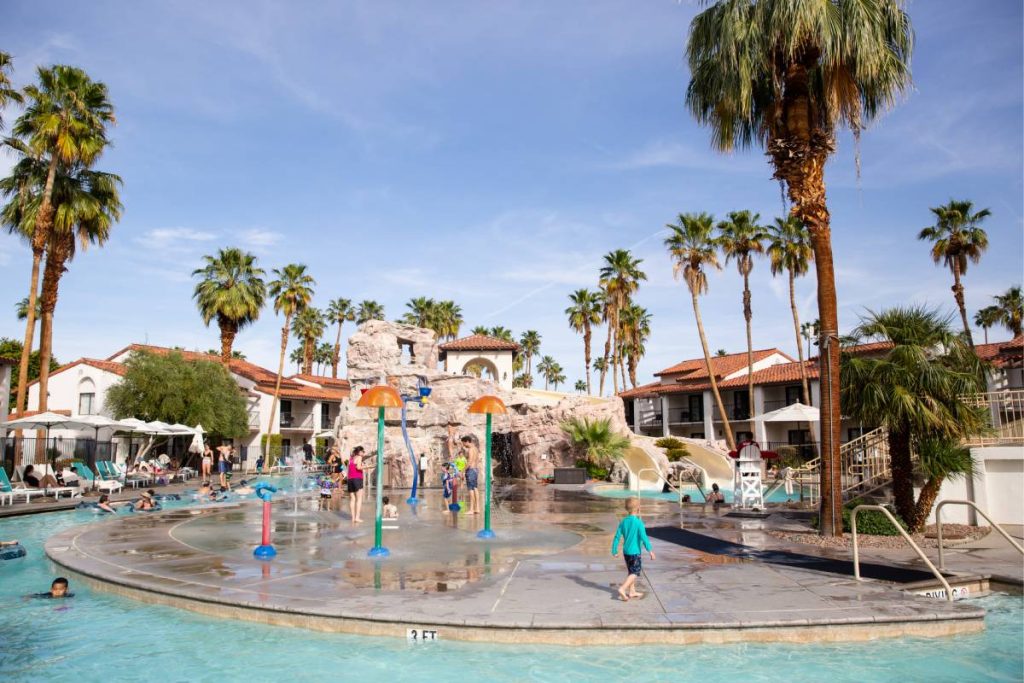 Omni Rancho Las Palmas is another beautiful Greater Palm Springs family-friendly resort that offers water slides. A day of fun at Splashtopia, featuring a 425-foot lazy river, two 100-foot water slides, cliffside jacuzzi, and sandy beach is a treat for the whole family. The play zones with sprinklers and fountains add to the thrills. Additionally, the resort offers one of the best in-house experiences of shopping, golf, tennis, and seasonal activities for children and adults.